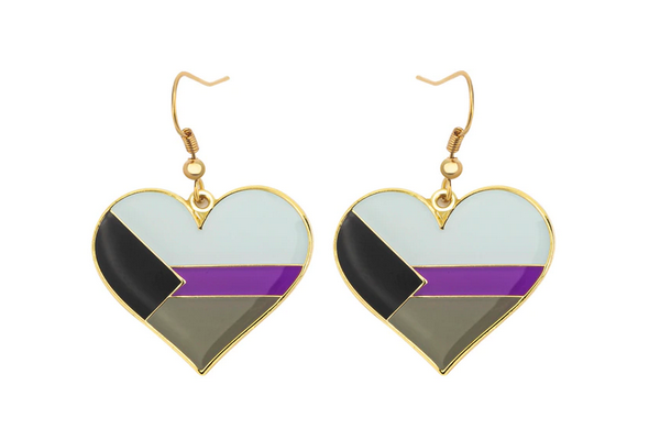 Our Heart Earrings are the perfect accessory for anyone wanting to proudly support the LGBTQ+ community. This pair of earrings features a heart shaped charm adorned with the colours of the asexual flag, accented in gold to add stylish flair. These earrings are comfortable and lightweight, perfect for adding a pop of pride to everyday outfits and special occasions. If you are looking for an accessory that shows your pride and support for the LGBTQ+ community, these earrings are the perfect choice.