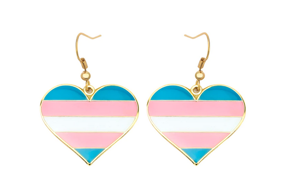 Our Heart Earrings are the perfect accessory for anyone wanting to proudly support the LGBTQ+ community. This pair of earrings features a heart shaped charm adorned with the colours of the trans flag, accented in gold to add stylish flair. These earrings are comfortable and lightweight, perfect for adding a pop of pride to everyday outfits and special occasions. If you are looking for an accessory that shows your pride and support for the LGBTQ+ community, these earrings are the perfect choice.